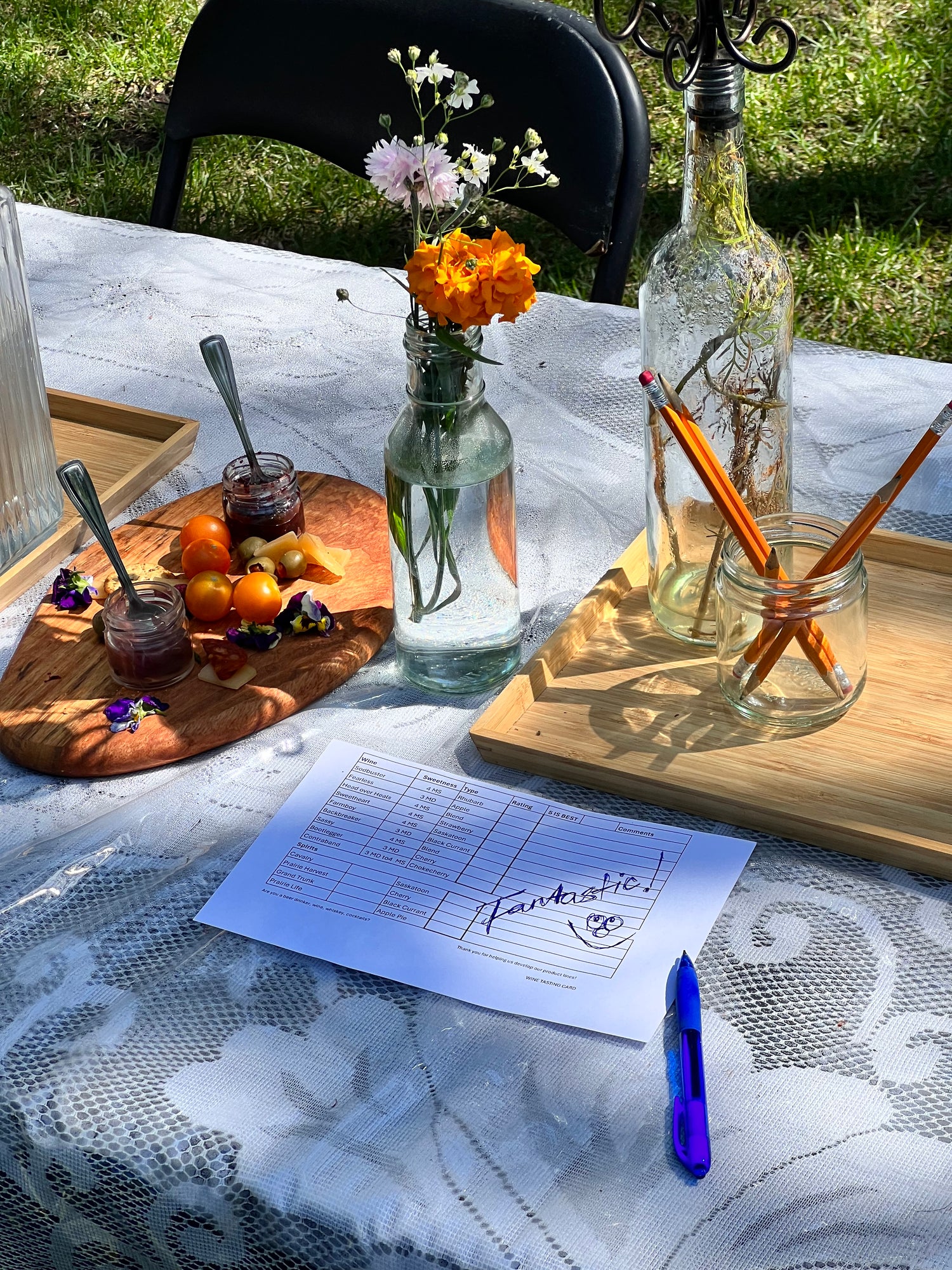 You will be outside, under a tent, with the full set up of hostess, wine glasses and scoring cards to keep track of what you tasted and what you liked.