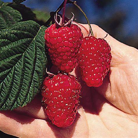 Introduced by the university of Saskatchewan, it is known for its HUGE berries and almost thorn less nature. The canes can grow up to 8' tall and should be supported, even though the canes grow upright and make for easy picking the weight of the berries will drag them down. This lovely sweet raspberry is self pollinating so you will only need one for lots of berries, that will be ready to harvest late June through July. Each year prune out all the old canes that will appear brown and woody.
